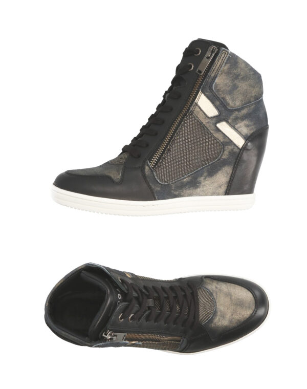 Détails : Tissu technique, cuir, lamé, effet laminé, logo, imprimé bicolore, fermeture avec cordons, pointe arrondie, sans talons, talon compensé interne, semelle en caoutchouc avec gravures, contient des parties non textiles d’origine animale.
