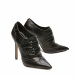 Détails : uni, inserts en métal, semelle en cuir, pointe arrondie, doublure en cuir, talon cône