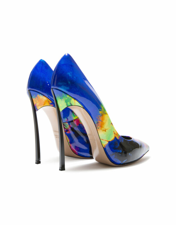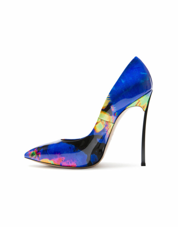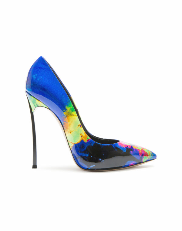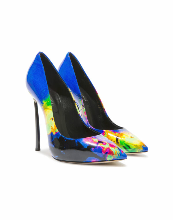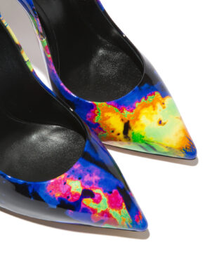 Parfaitement en équilibre entre féminité et design, cet escarpin iconique en cuir verni imprimé effet batik multicolore se distingue par son talon « Blade » en acier, aiguisé comme une lame.Talon « Blade » en acier métallisé véritable.