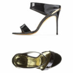 Détails : inserts en métal, imprimé bicolore, open toe, intérieur doublure, semelle en cuir biologique, talon en bois