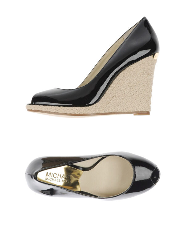 Détails : effet vernis, uni, open toe, semelle en caoutchouc, talon compensé, sans applications