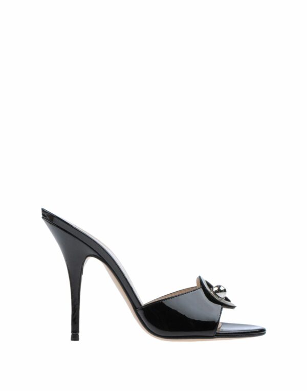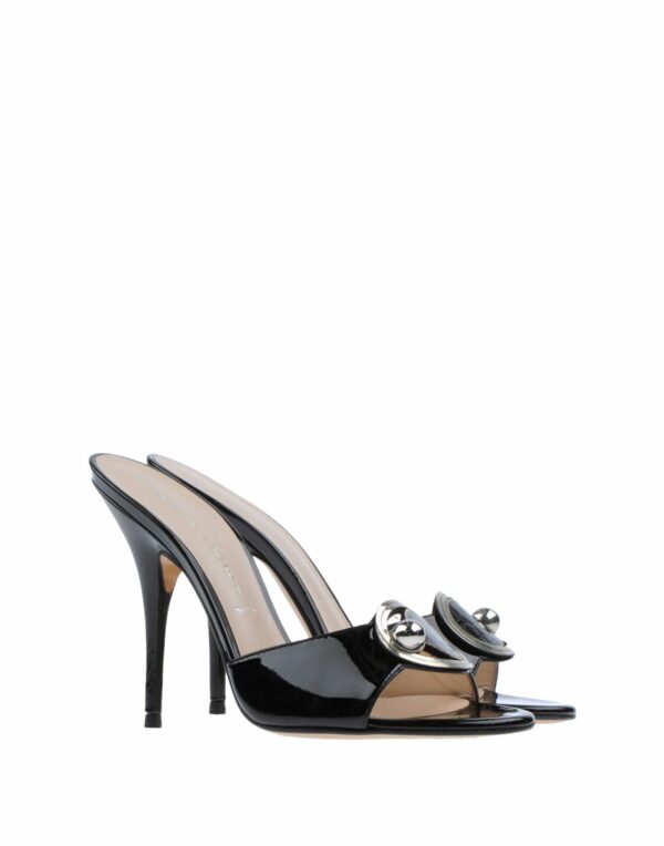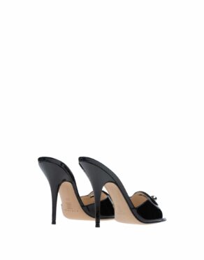 Détails : effet vernis, teinte unie, pointe arrondie, inserts en métal, semelle en cuir, talon aiguille recouvert