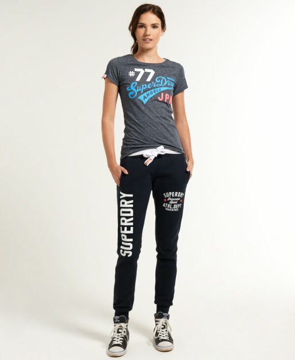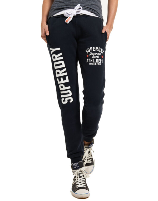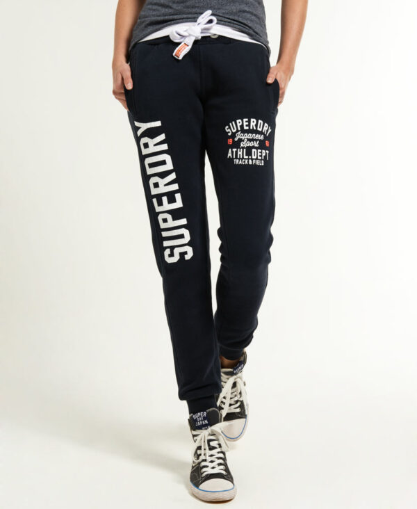 Pantalon de jogging femme Superdry Trackster. Pantalon de jogging classique, coupe trois poches, chevilles élastiquées, cordon de serrage à la ceinture, étiquette logo Vintage Superdry sur la poche arrière et logos imprimés craquelés sur le devant des jambes.