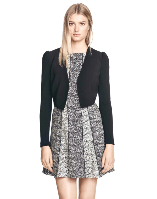 Boléro tissé avec manches bouffantes en fine maille côtelée. Modèle sans boutonnage. Doublé.