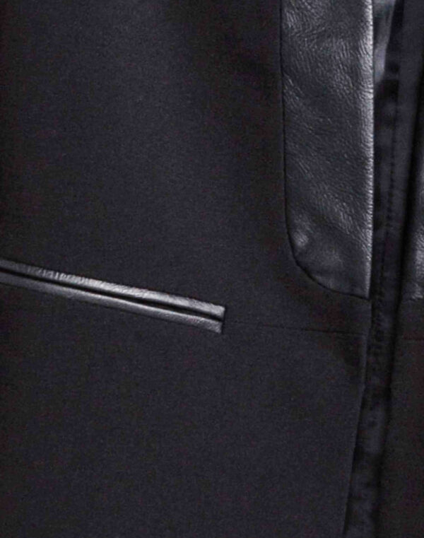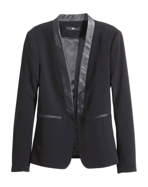 Blazer de coupe ajustée en tissu légèrement brillant avec détails en imitation cuir. Modèle à revers étroits avec poches passepoilées devant. Sans boutonnage. Doublé.