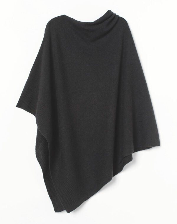 Poncho en maille fine et douce de laine et cachemire mélangés. Modèle avec col drapé et finition côtelée sur un côté.