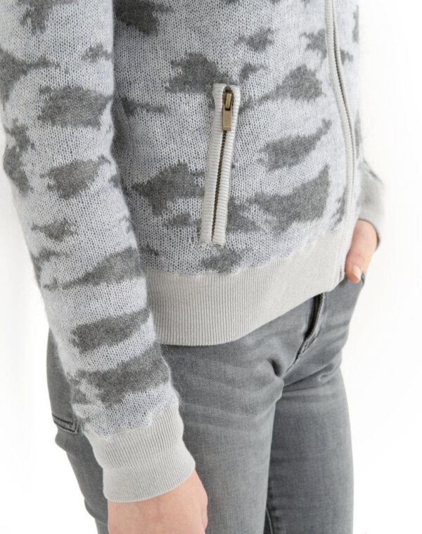 Bomber en maille douce imprimée. Encolure ronde, fermeture zippée. Col, poignets et base en bord-côtes unis. 2 poches verticales zippées sur le devant.