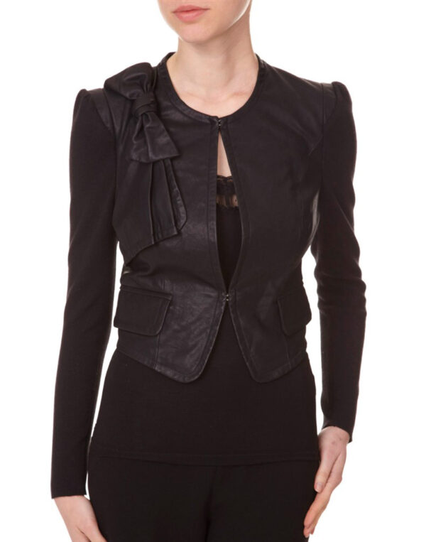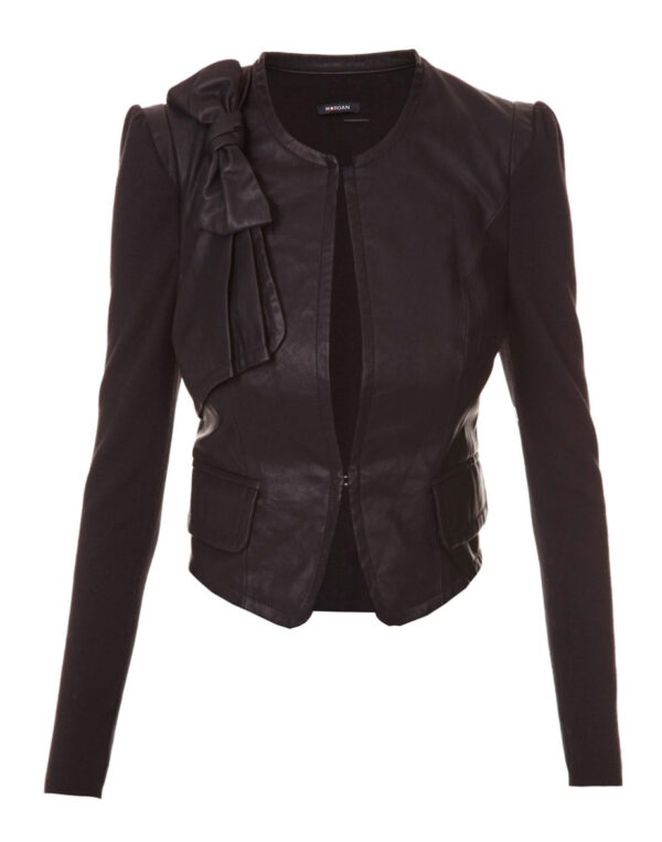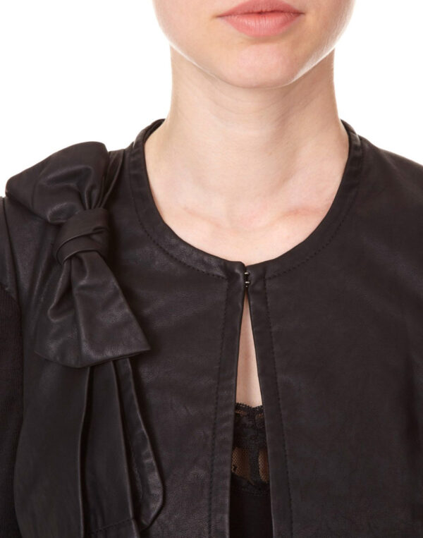 Cette veste allie le similicuir et une maille fine de la même couleur pour une touche très mode ! On craque littéralement pour l’effet drapé et le noeud sur l’épaule. Veste, courte, col rond, manches longues, bimatière, similicuir, maille fine, coloris uni, 2 poches. Le plus mode : Les manches ballons très féminines.