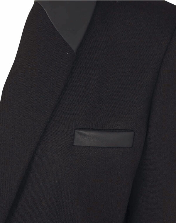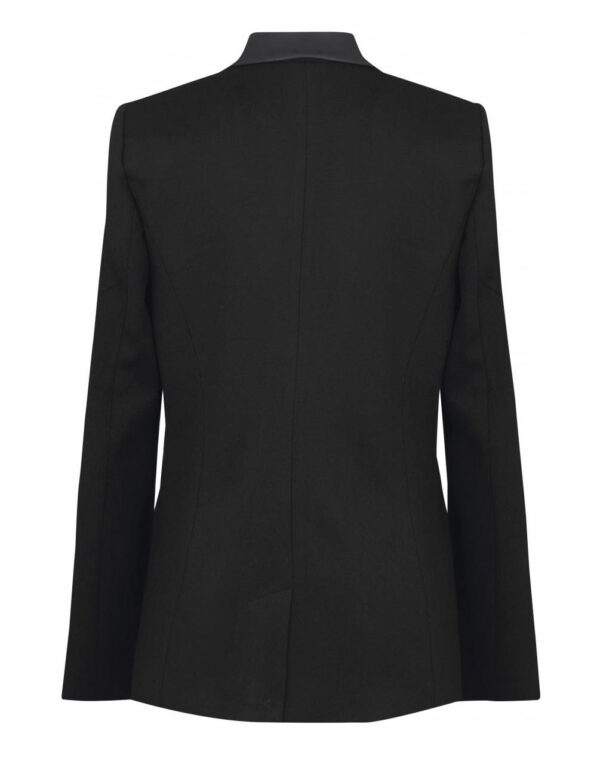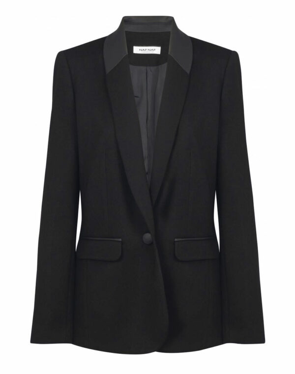 Veste tailleur coupe cintrée, longueur sous les fesses. Emmanchures droites, manches longues. Col tailleur sans cran avec empiècement similicuir. Pinces verticales devant, découpes princesse et couture centrale au dos. 2 poches à revers gansé devant. Fermeture centrale par bouton recouvert. Fente au dos. Avec son col similicuir, ses poches à revers gansés et son bouton recouvert, cette veste longue de tailleur sait apporter un peu de fantaisie dans le quotidien de la working girl !