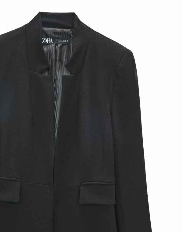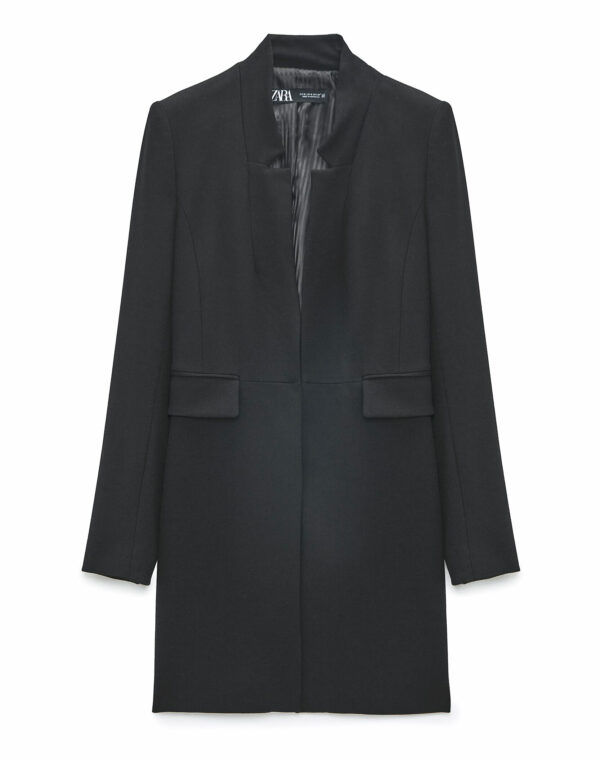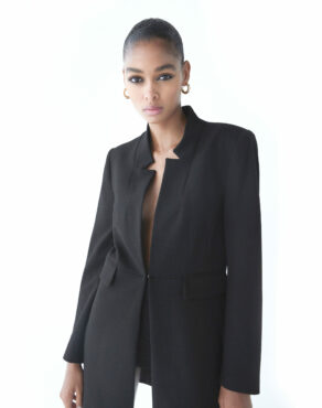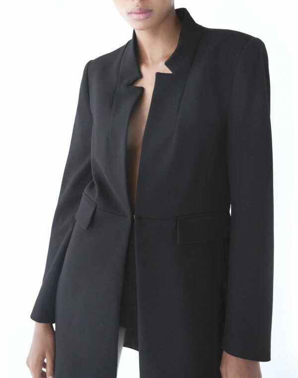 Veste longue à col montant, manches longues et épaules marquées. Poches avant. Fermeture sur le devant par bouton-pression.