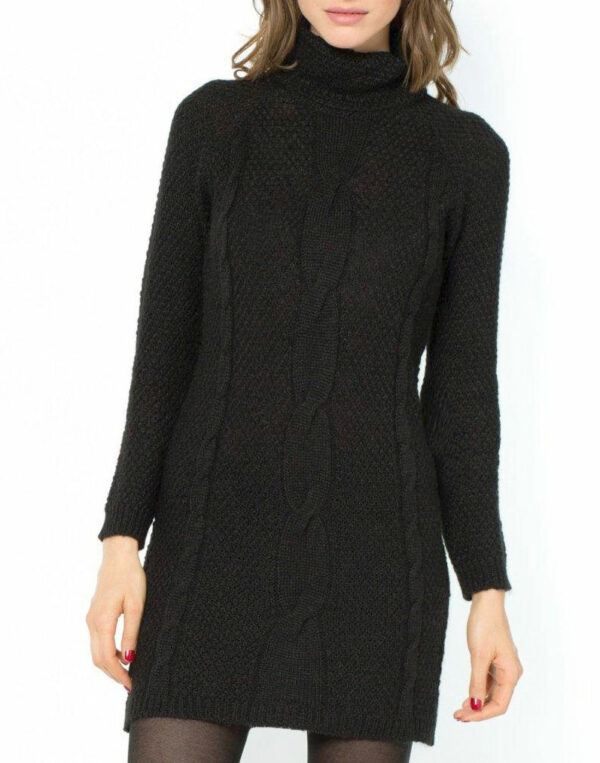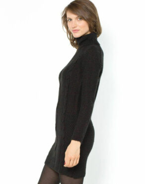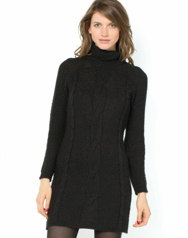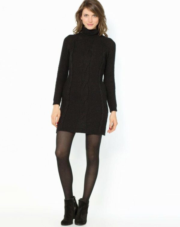 La robe-pull. Maille fantaisie. Torsades devant. Finition bord-côtes. Manches longues. Long. 85 cm env.