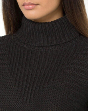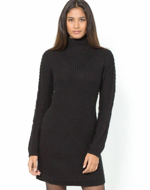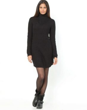 Le robe-pull. Maille jersey rehaussée de jeux de maille fantaisie. Col roulé. Manches longues. Base légèrement arrondie. Finition bord-côtes. Long. 90 cm env.