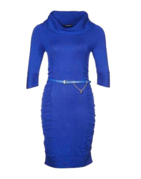 Robe en maille, à manches mi-longues. Coupe courte moulante. Col ample côtelé. Jeu de fronces sur les côtés. Fine ceinture, taille haute, avec chaînette et pendentif métal. Bases des manches et de la robe nervurées.