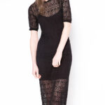 Robe en maille, à manches mi-longues. Coupe courte moulante. Col ample côtelé. Jeu de fronces sur les côtés. Fine ceinture, taille haute, avec chaînette et pendentif métal. Bases des manches et de la robe nervurées.