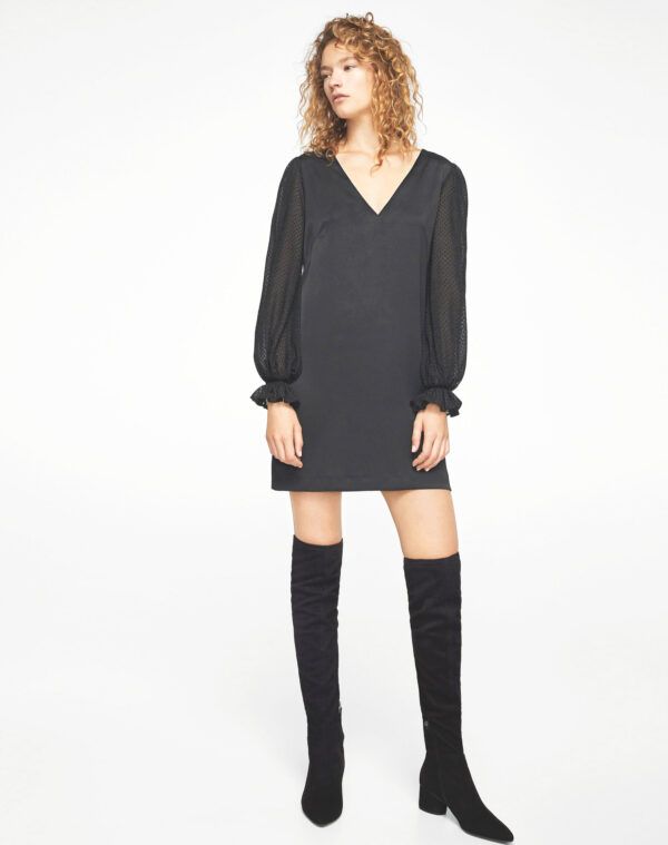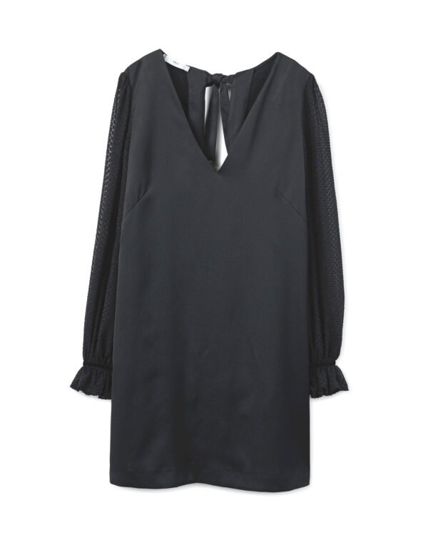 Tissu satiné. Empiècement plumetis. Dos en V. Nœud décoratif au dos. Manches longues avec poignets élastiques.