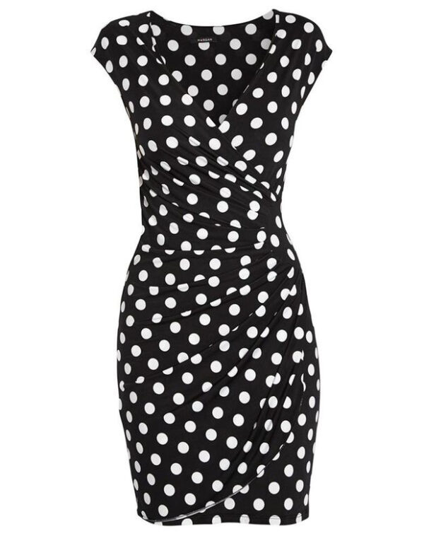 Cette robe féminine au style graphique vous donnera une allure glamour et élégante au quotidien. Une robe bicolore à la coupe moulante, longueur mi-cuisses. Robe façon portefeuille avec encolure en V et manches courtes. La pièce propose un motif à pois. À porter avec des talons pour élancer la silhouette
