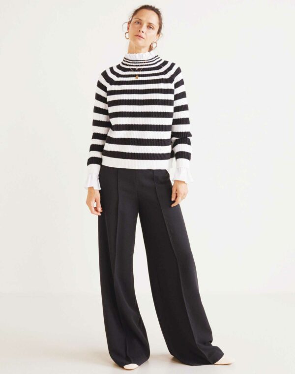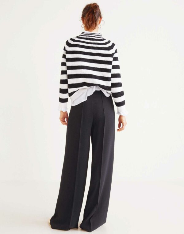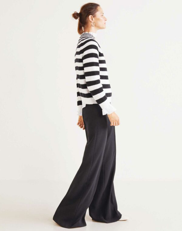 Tissu fluide. Droit. Taille haute. Pinces. Fermeture Éclair dissimulée sur le côté.