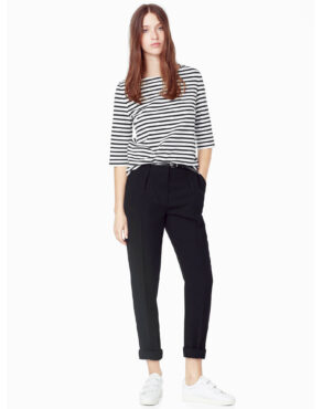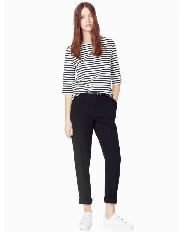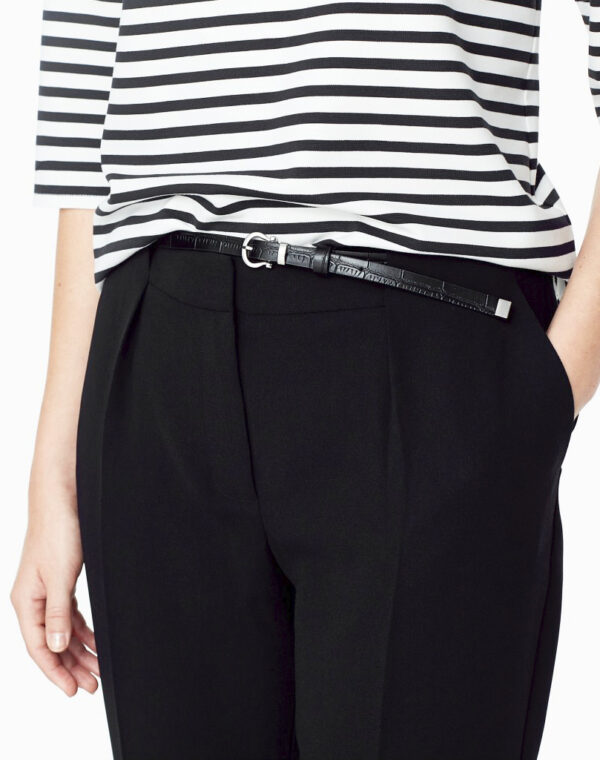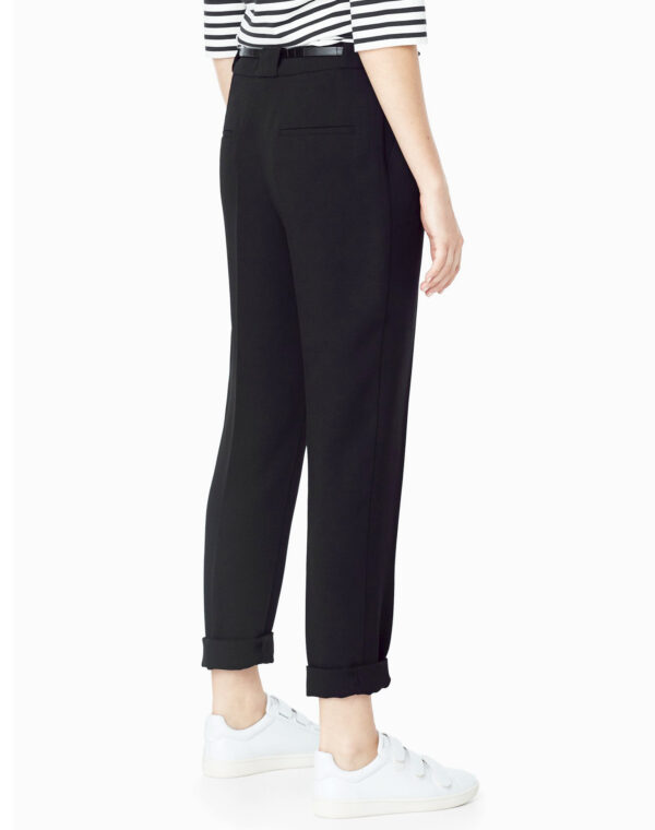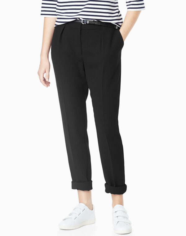 Tissu de coton mélangé, deux poches latérales, passants pour la ceinture, fermeture Éclair avec crochet, deux poches passepoilées à l’arrière, ceinture amovible à la taille.