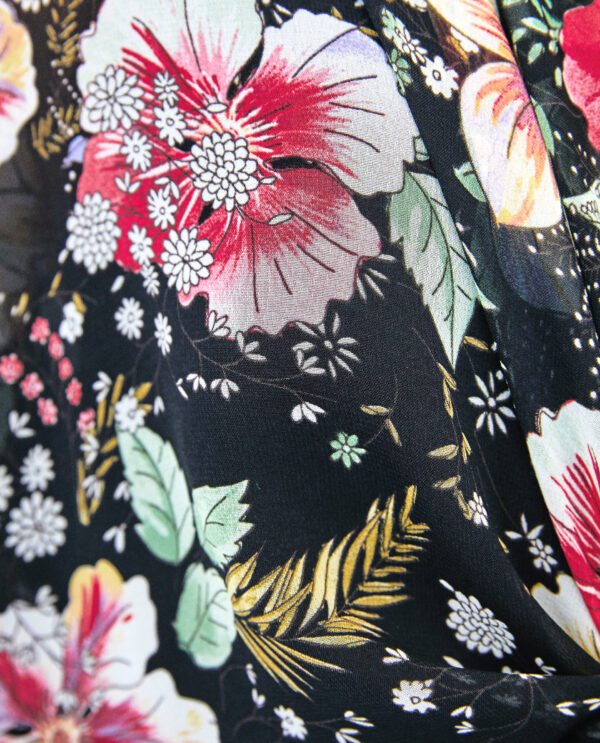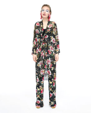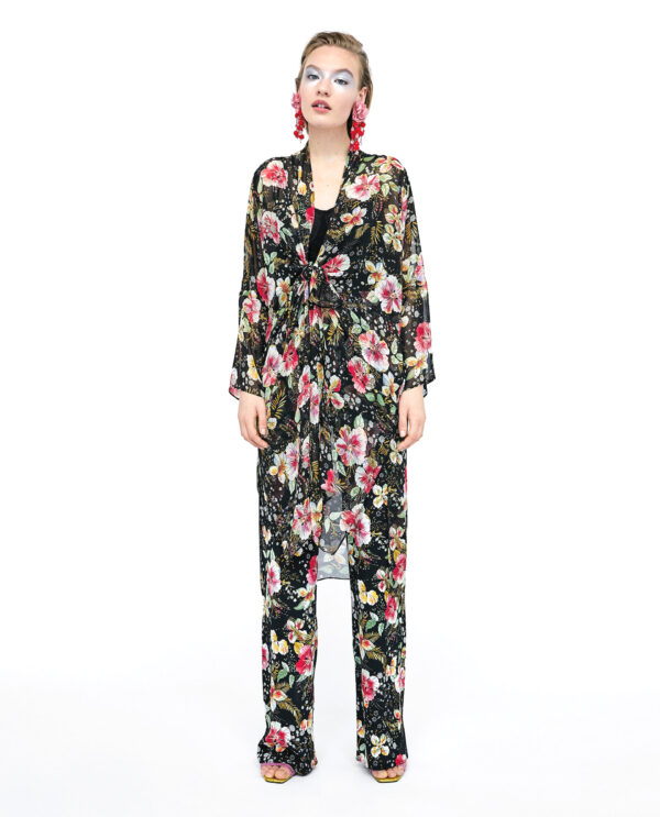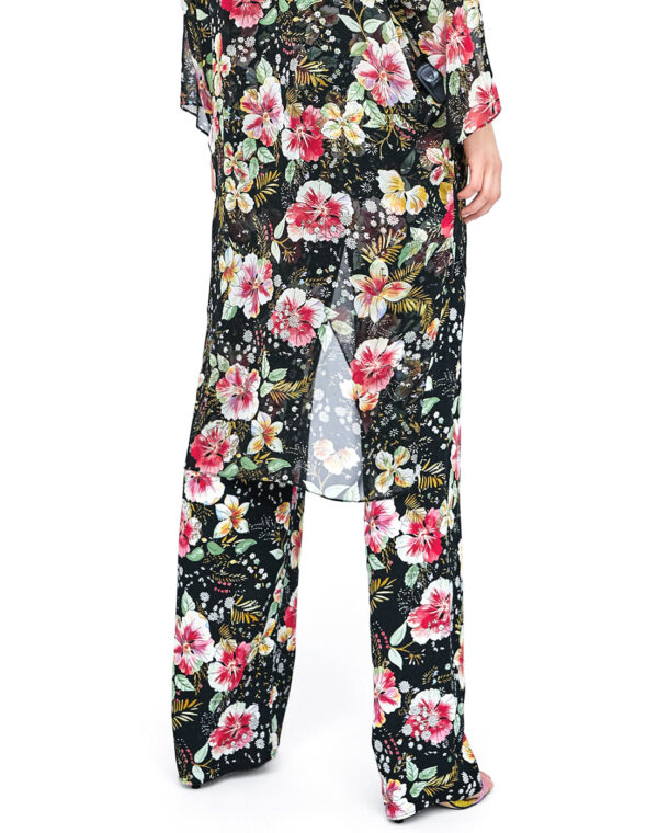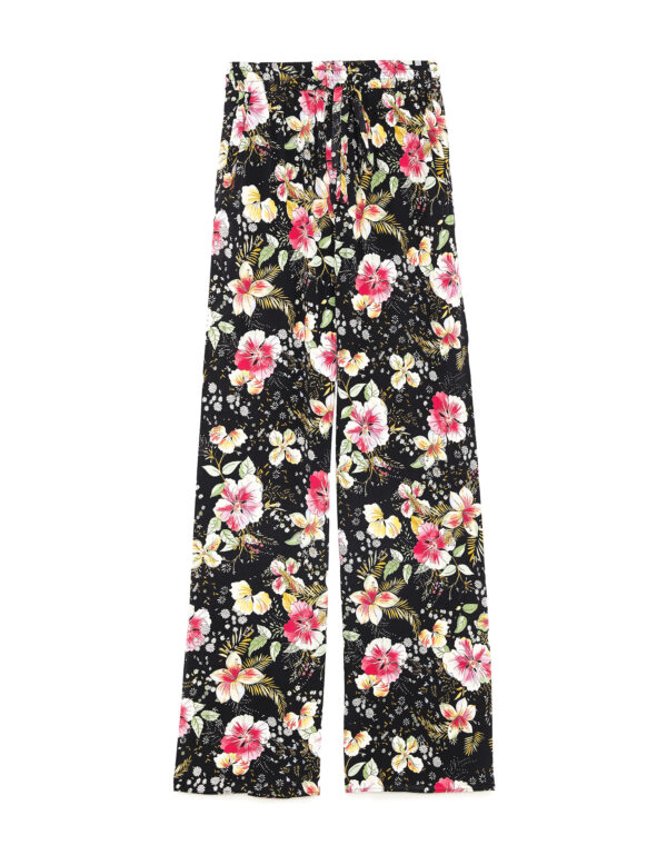 Pantalon fluide à taille élastique réglable par lacet de même tissu. Poches avant.