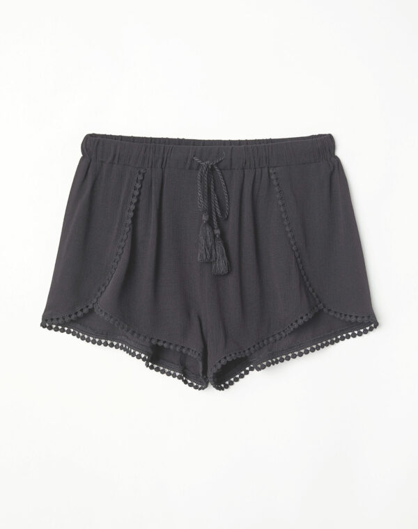 Short court en viscose tissée. Modèle avec élastique et lien de serrage agrémenté de pompons à la taille. Finition par bords en dentelle au crochet devant et en bas de jambe.