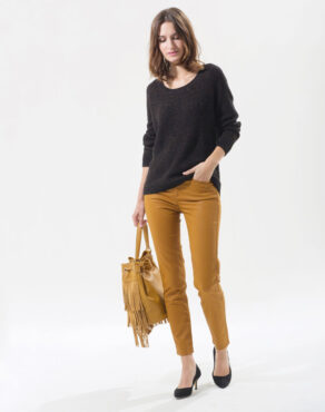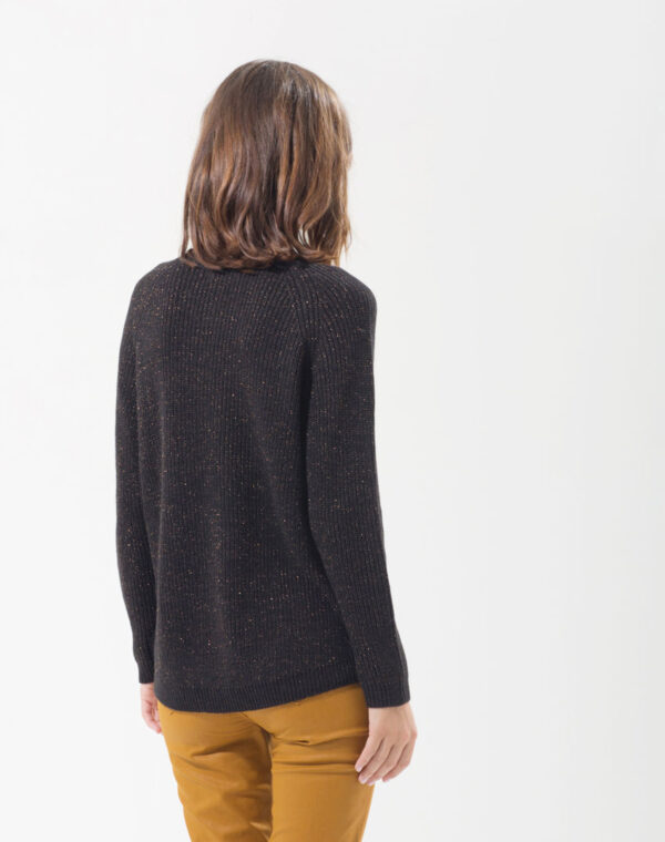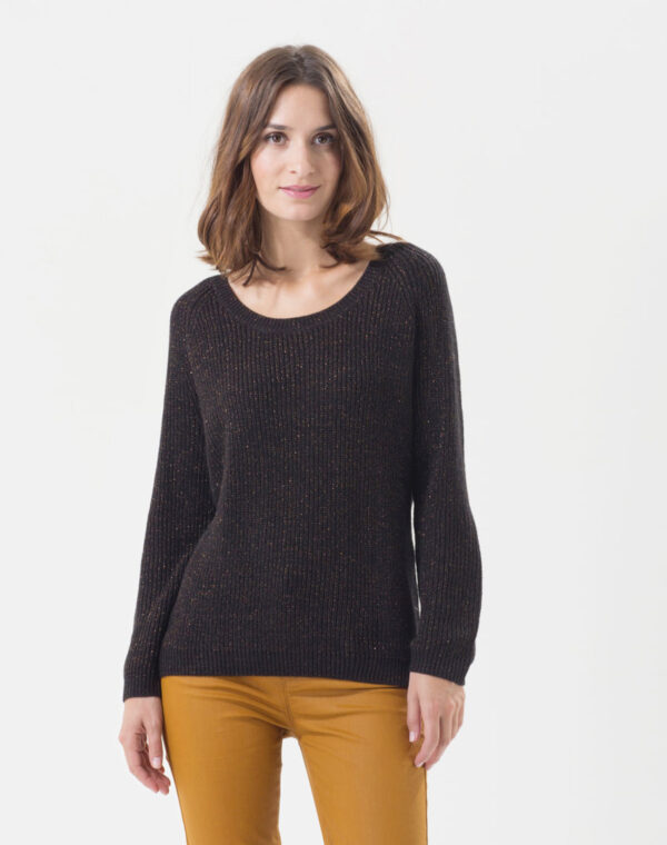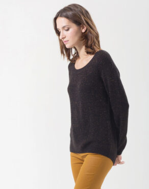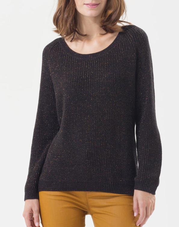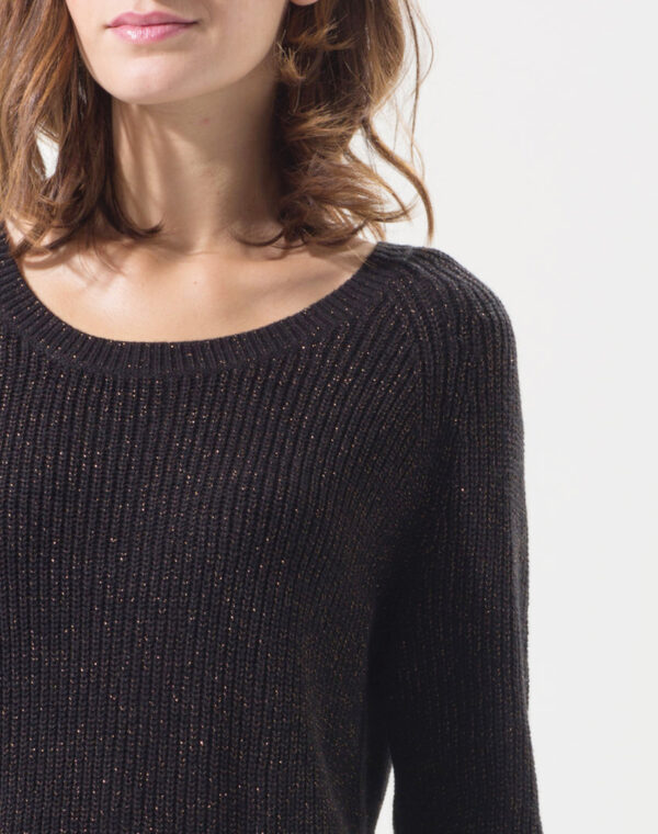 Porté large sur un pantalon près du corps, ce pull noir nous séduit par ses fibres métallisées.