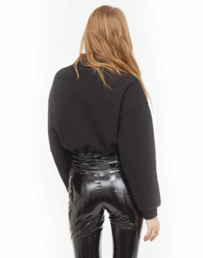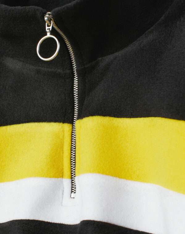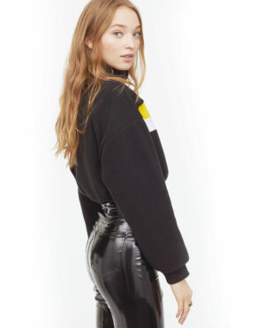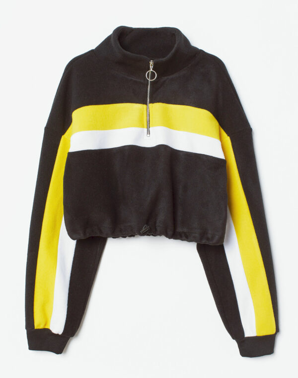 Top court en polaire doux. Modèle avec col droit et fermeture à glissière devant. Emmanchure fortement descendue et finition bord-côte en bas des manches longues. Lien de serrage élastique à la base.