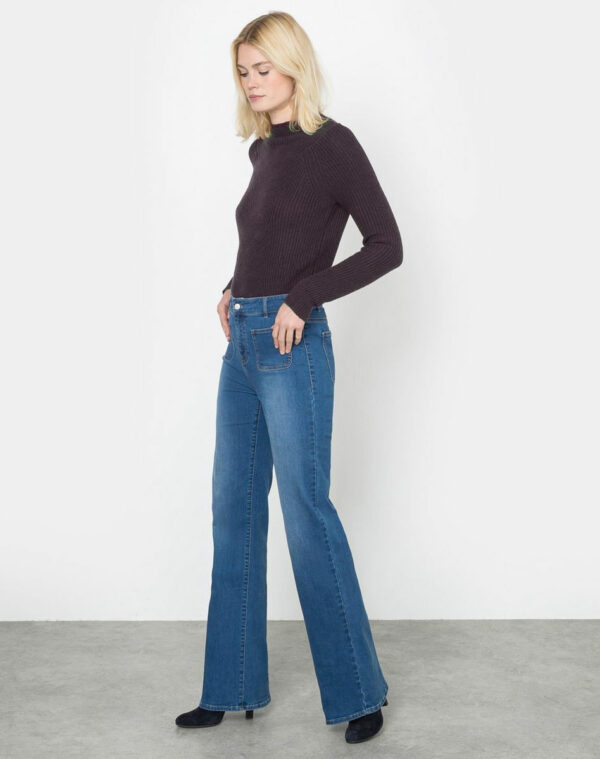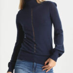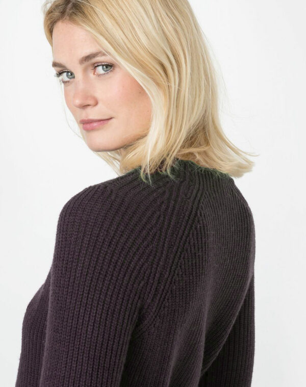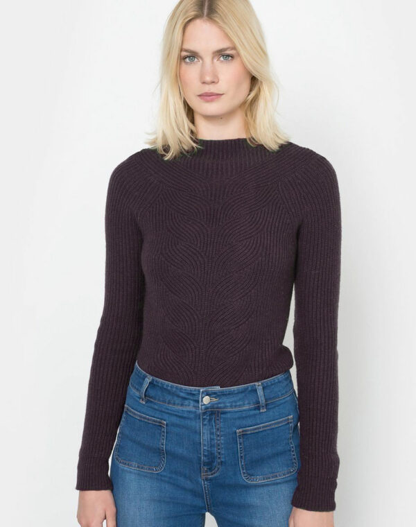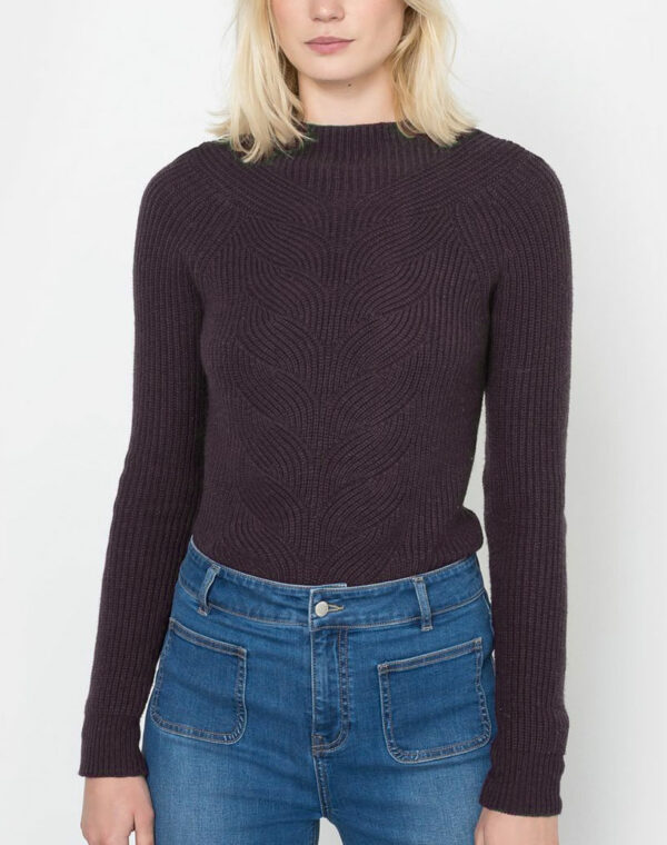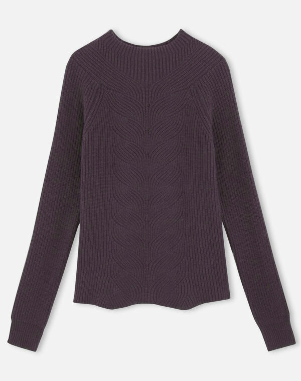 Le pull col montant, en côtes. Motif torsadé sur le devant. Manches longues, emmanchures raglan.