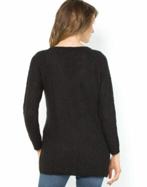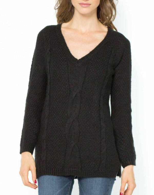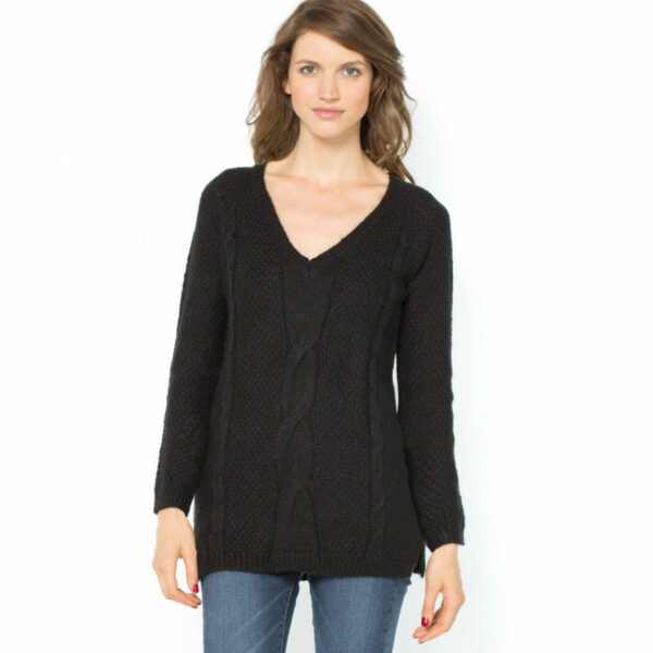 Le pull tunique col V. Maille fantaisie. Torsades devant. Finition bord-côtes. Manches longues. Long. dos 75 cm env.
