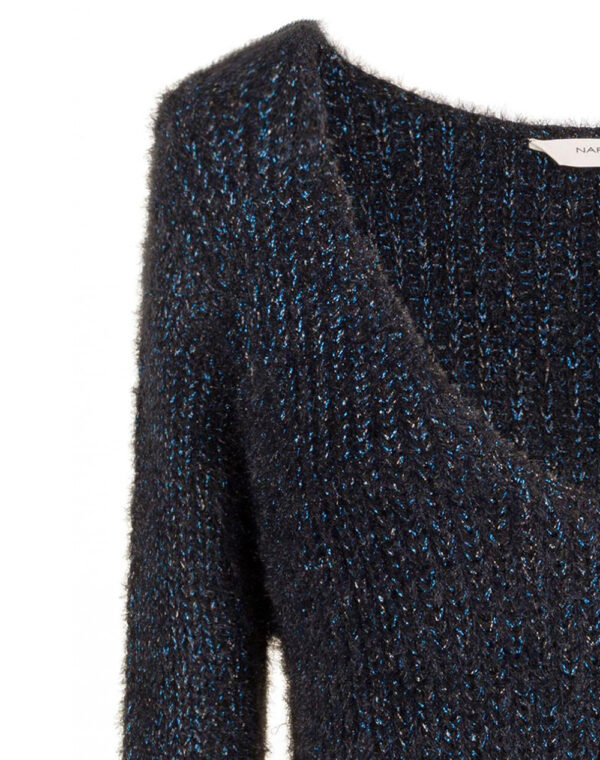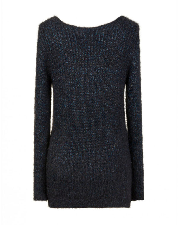 Pull long uni, coupe ajustée. Manches longues, col V large. Grosse maille agrémentée de fil métallisé pour une pointe d’éclat. Bord-côtes au bas des manches et au bas du pull. Longueur : 67 cm.