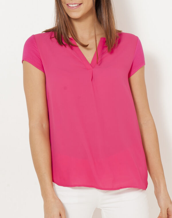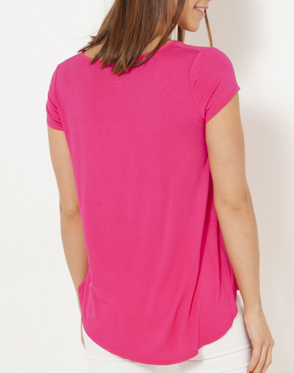 Ce t-shirt fluide femme est le modèle essentiel qui allie élégance et simplicité à vos tenues. On aime son encolure en V, sa texture légère sur le devant et sa base dos rallongée.