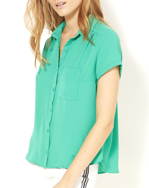 Adepte du look preppy ? Laissez-vous séduire par cette blouse femme vaporeuse aux manches courtes. On aime ses liserés brodés qui ornent la poche poitrine et le bas des manches. Cette blouse se ferme à l’aide de petits boutons sur le devant.