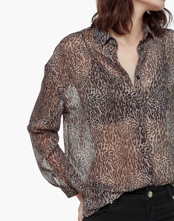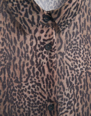 Tissu semi-transparent, imprimé léopard, col chemise, manches longues avec poignets boutonnés, fermeture boutonnée sur le devant.