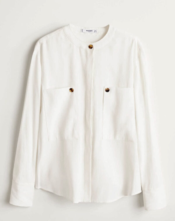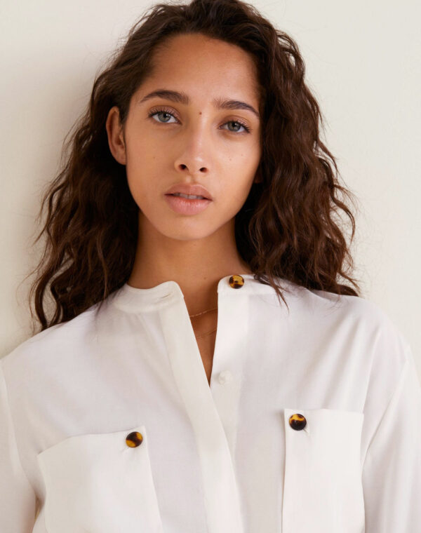 Tissu fluide. Col rond. Manches longues boutonnées. Deux poches plaquées sur la poitrine. Poches empiècement. Boutons décoratifs. Boutons effet écaille. Fermeture boutonnée sur le devant.