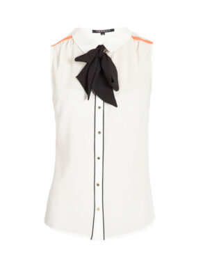 Hissez-vous au sommet de la mode avec cette chemise sans manches ornée d’un gros noeud cravate ! Coupe droite, col italien, sans manches, longueur hanches. Boutonnière avec liseré contrastant, boutons fantaisie en métal. Le plus mode : son liseré contrastant sur les épaules et son noeud esprit lavallière.