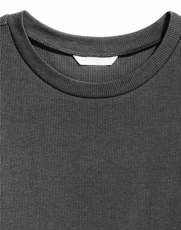 Top à manches longues en jersey côtelé. Modèle droit et plutôt long avec base arrondie.