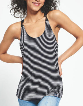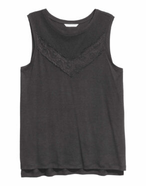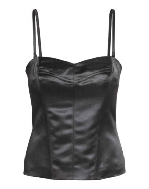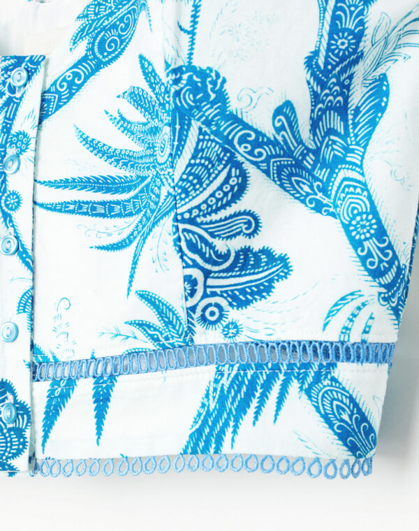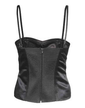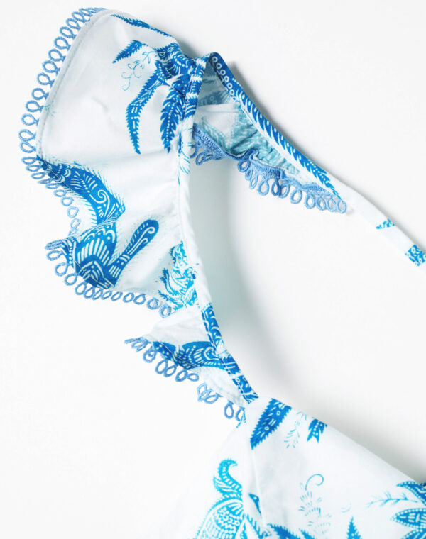 Bustier tissé à encolure en V. Modèle avec fines bretelles volantées et croisées dans le dos. Boutonnage devant et rubans agrémentés de broderies ajourées incrustés à la base. Doublé.