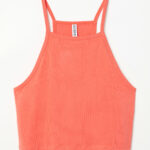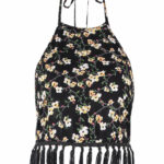 Bustier tissé à encolure en V. Modèle avec fines bretelles volantées et croisées dans le dos. Boutonnage devant et rubans agrémentés de broderies ajourées incrustés à la base. Doublé.