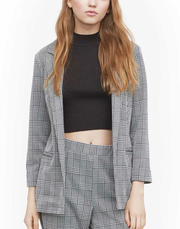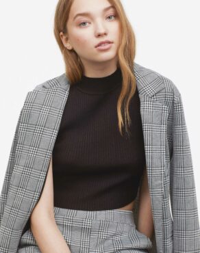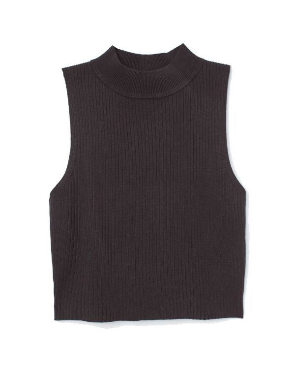 Top court en maille côtelée de viscose mélangée. Modèle sans manches avec col droit.
