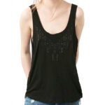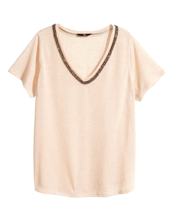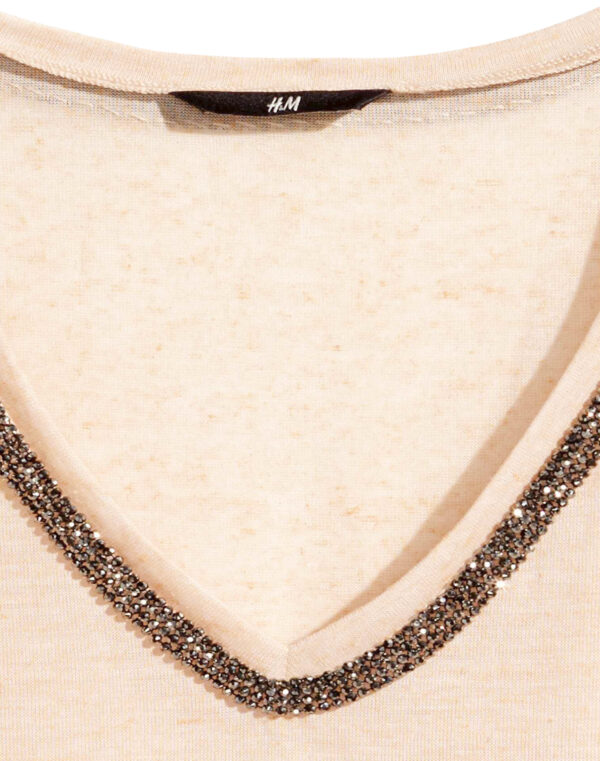 Top à encolure en V en jersey de lin mélangé. Modèle avec broderies de strass autour de l’encolure.