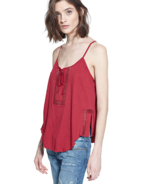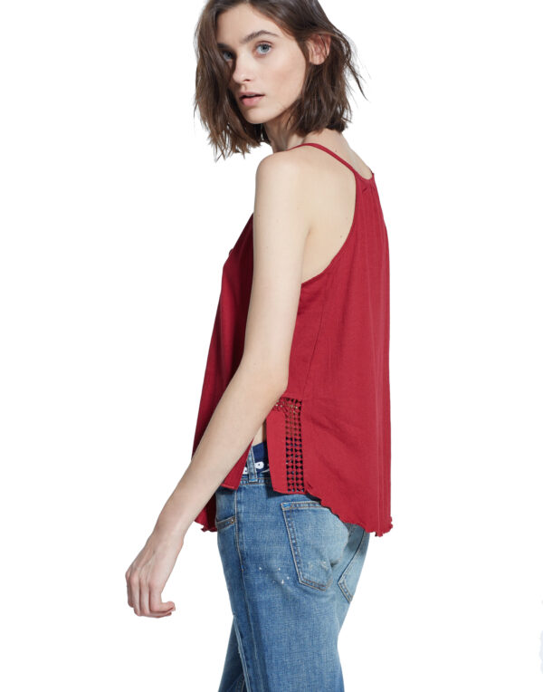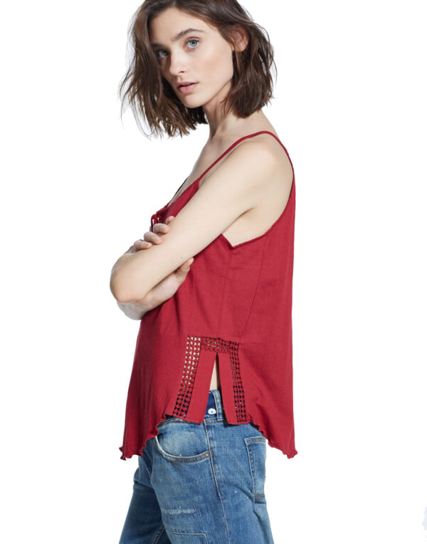 Top à bretelles en coton mélangé. Col rond, empiècement ajouré avec cordon à nouer et fermeture boutonnée dissimulée sur le devant, fentes à la base.