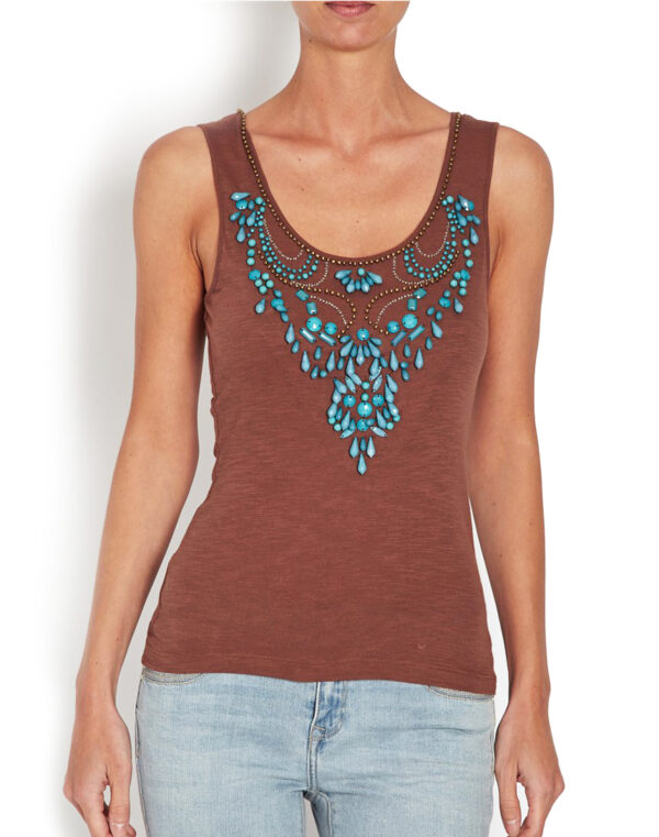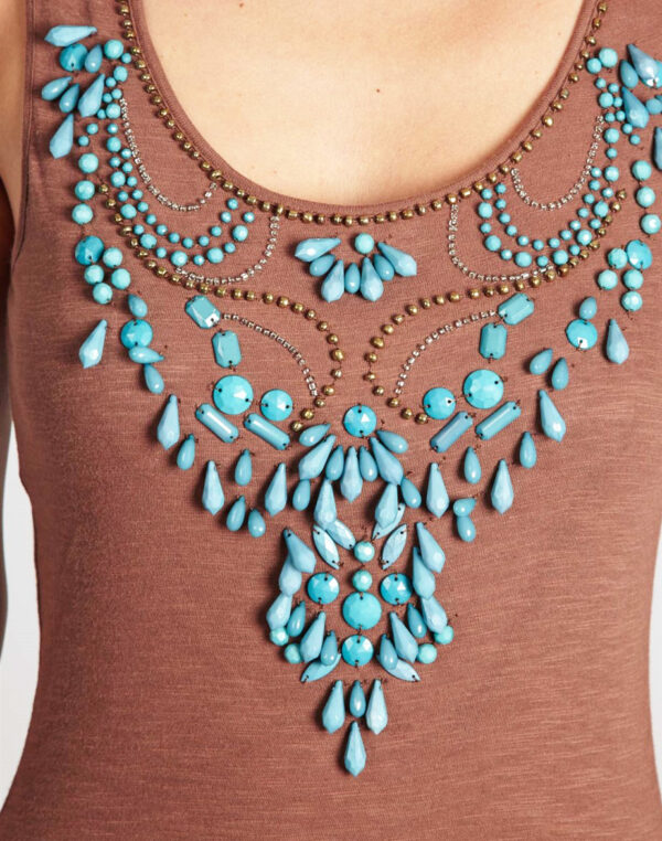 Idéal pour arborer un style folk ou ethnique chic, ce débardeur se pare de perles et de cabochons pour se faire bijou. Coupe ajustée, col rond, sans manches, longueur hanches. 100% coton. À porter avec un jean used pour une allure décontractée et tendance.