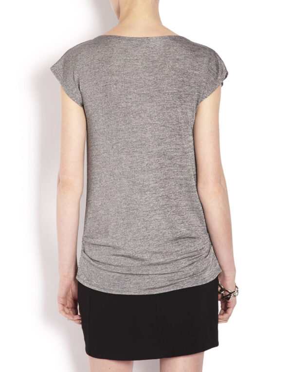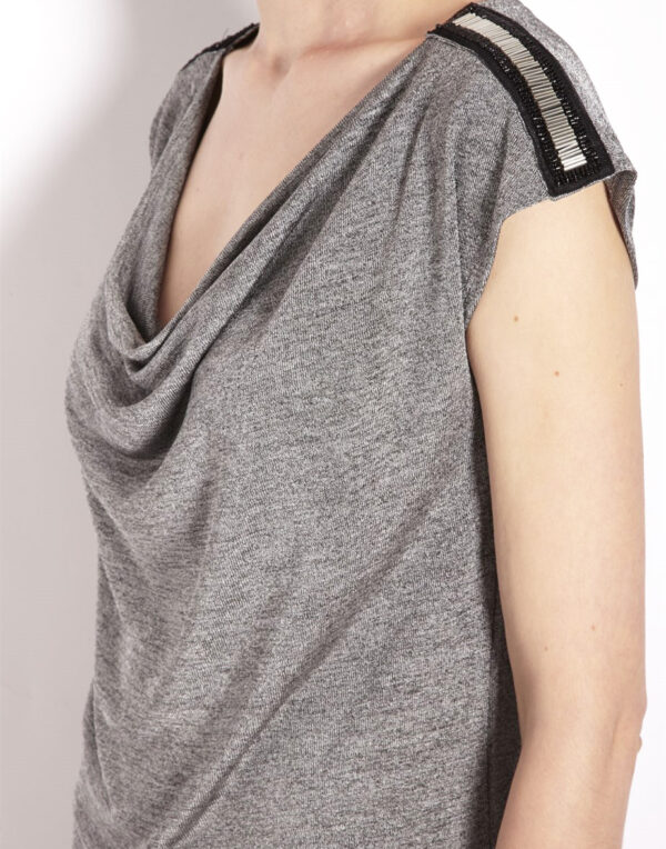 Soyez élégante en portant ce tee-shirt à la coupe loose et son col bénitier qui crée un drapé très chic. Les épaules sont rehaussées de perles de couleurs différentes. Tee-shirt, coupe loose, col bénitier, manches courtes, coloris chiné. Le plus mode : les perles sur les épaules.