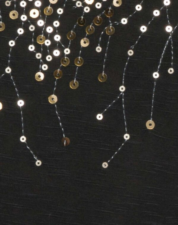 Débardeur à « brillants » en jersey flammé doux et fluide. Pluie de « brillants » coloris doré mat et brillant sur le devant. Large encolure arrondie. Longueur : 65 cm environ.