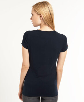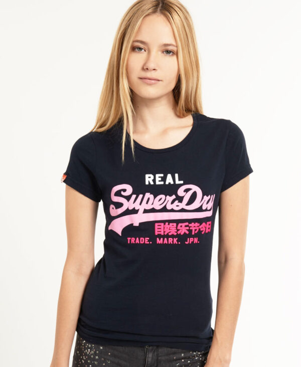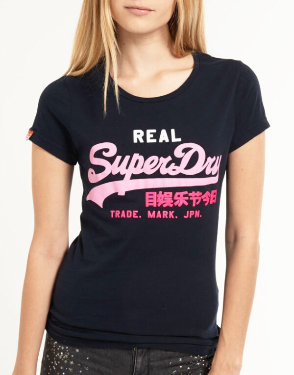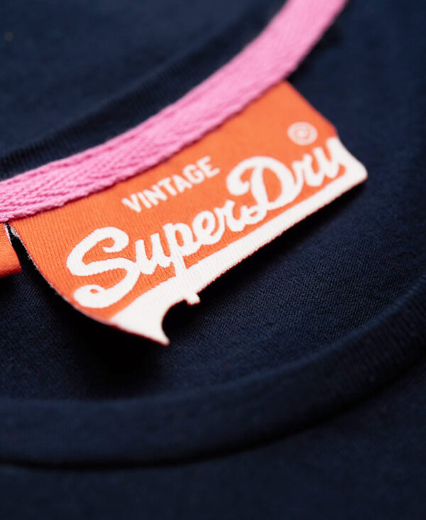 T-shirt femme vintage Superdry à logo tricolore. T-shirt de coupe classique, avec version bicolore, brillante et en relief de l’emblématique logo Real Superdry. Le t-shirt porte une étiquette logo Vintage Superdry sur la manche.
